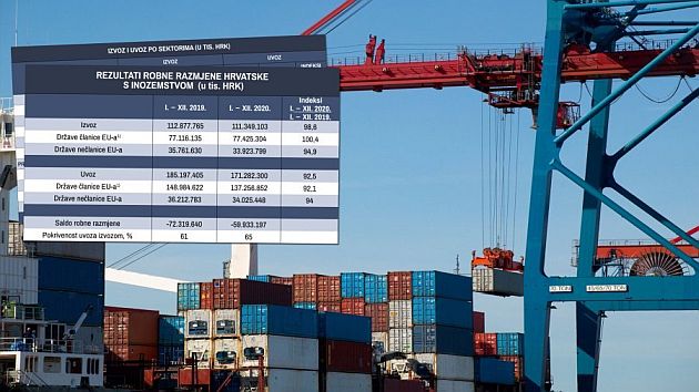 Zahvaljujući znatno većem padu uvoza nego izvoza, vanjskotrgovinski deficit je u prošloj godini u odnosu na 2019. smanjen za 17,1 posto, na 59,9 milijardi kuna. Povoljniji omjer izvoza i uvoza rezultirao je i znatno višom pokrivenošću uvoza izvozom nego ranijih godina. Dok je 2019. pokrivenost uvoza izvozom iznosila tek 61 posto, lani je dosegnula 65 posto.