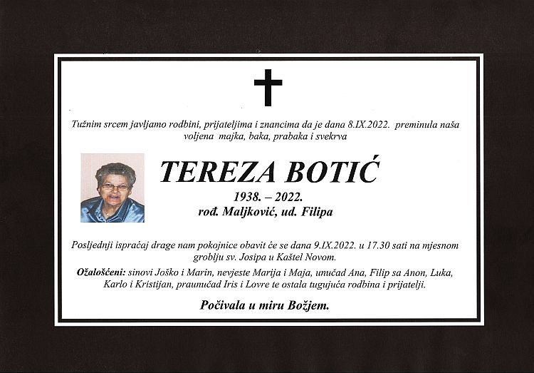 OŽALOŠĆENI: sinovi Joško i Marin, nevjeste Marija i Maja, unučad Ana, Filip sa Anon, Luka, Karlo i Kristijan, praunučad Iris i Lovre te ostala tugujuća rodbina i prijatelji